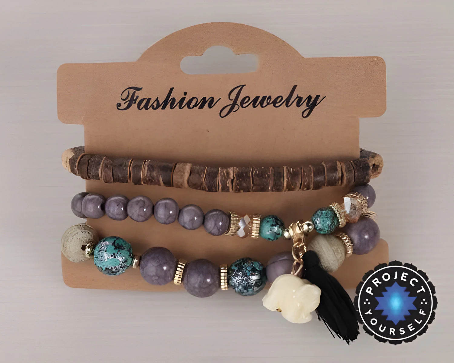 3-Piece Stone and Wood Beads Elephant Charm Boho Bracelet Set