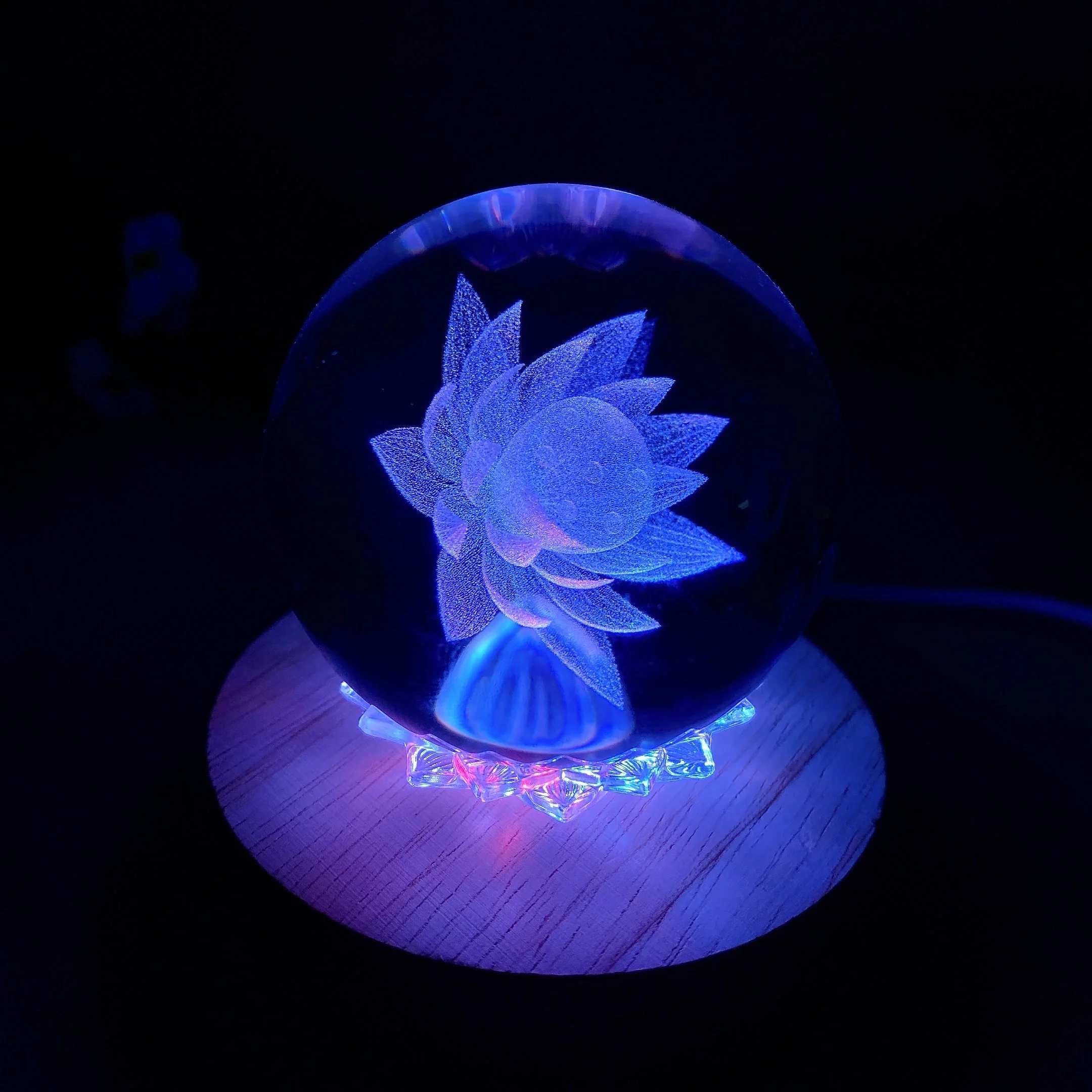 Masterfully crafted with a polished wooden base and a stunning transparent crystal dome, this decorative accent piece features an intricate lotus flower engraving that symbolizes spiritual awakening and purity. The combination of natural wood and illuminated crystals creates a harmonious balance of earthy stability and ethereal light.
